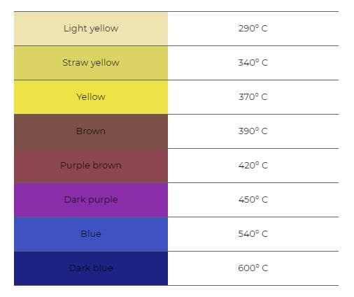 در نتیجه استفاده از دماهای مختلف و روش های ساخت در طول فعالیت ، رنگهای متنوعی به وجود می آید که این رنگها از زرد روشن تا آبی تیره به ترتیب افزایش HAZ را به ما نشان میدهد.